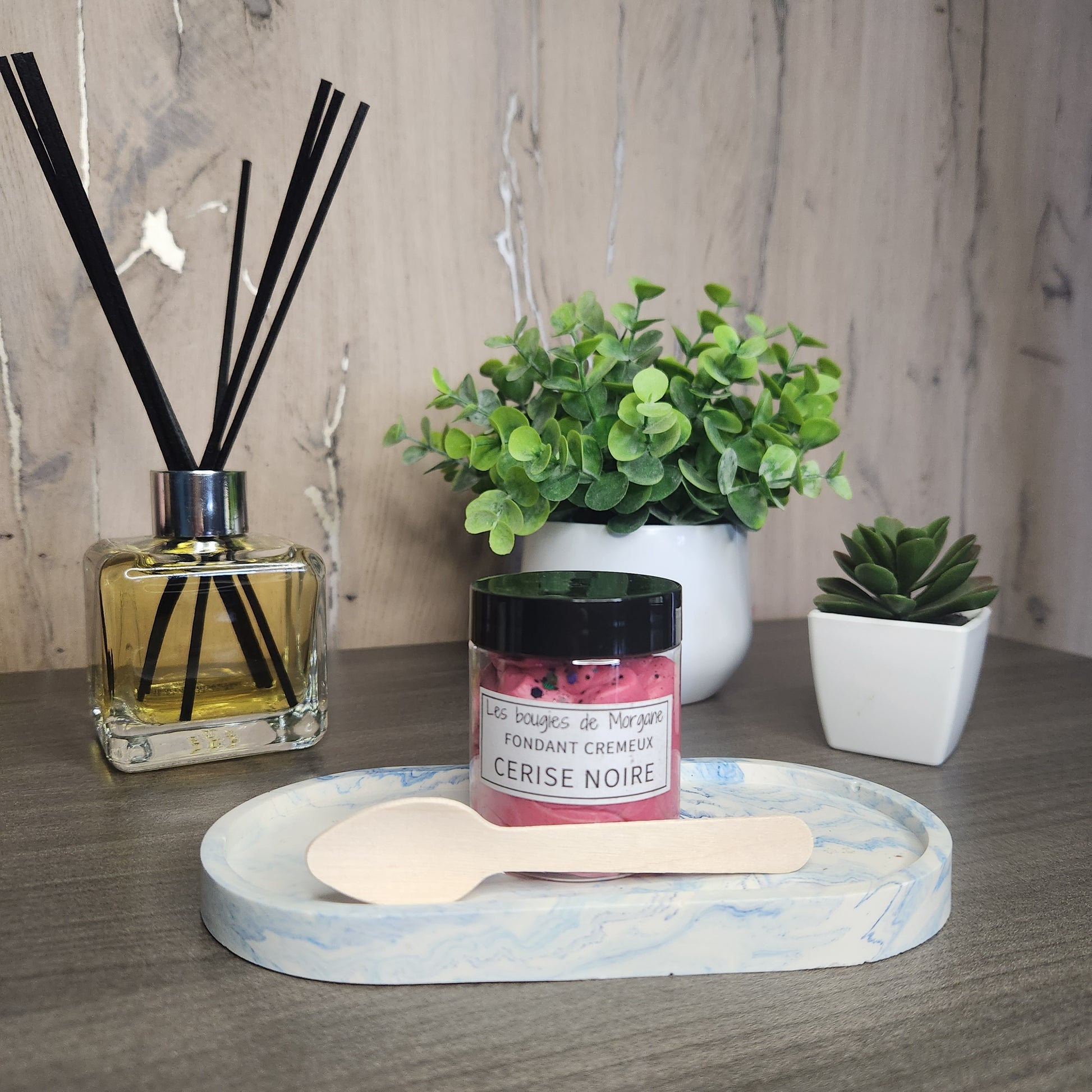 Ingrédients: Cire de soja 100% végétale, suivie de fragrance de Grasse, huile de coco, colorant. Cuillère en bois fourni avec le fondant.