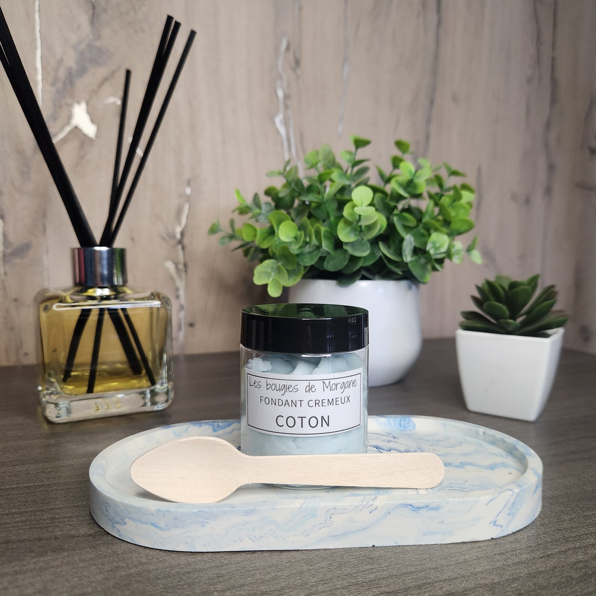 Ingrédients: Cire de soja 100% végétale, suivie de fragrance de Grasse, huile de coco, colorant. Cuillère en bois fourni avec le fondant.
