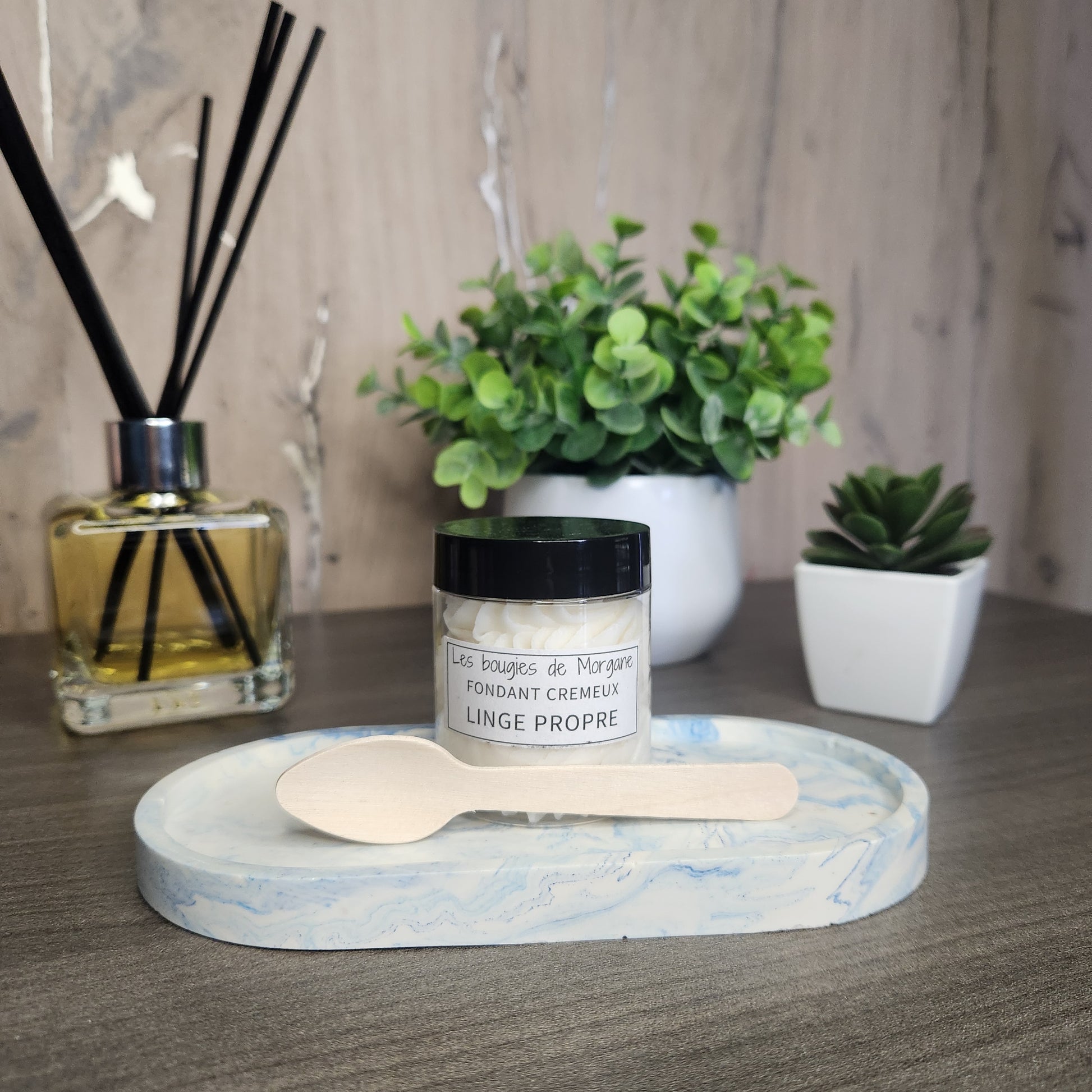 Ingrédients: Cire de soja 100% végétale, suivie de fragrance de Grasse, huile de coco, colorant. Cuillère en bois fourni avec le fondant.