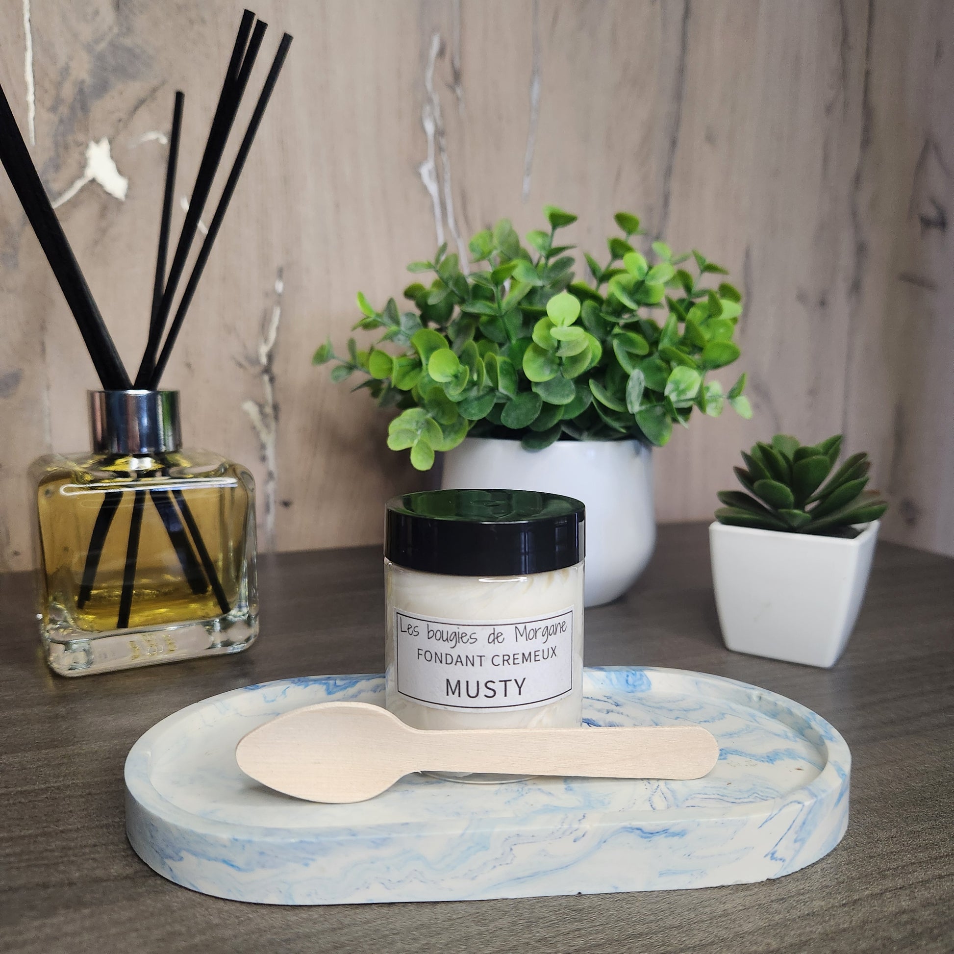 Ingrédients: Cire de soja 100% végétale, suivie de fragrance de Grasse, huile de coco, colorant. Cuillère en bois fourni avec le fondant.