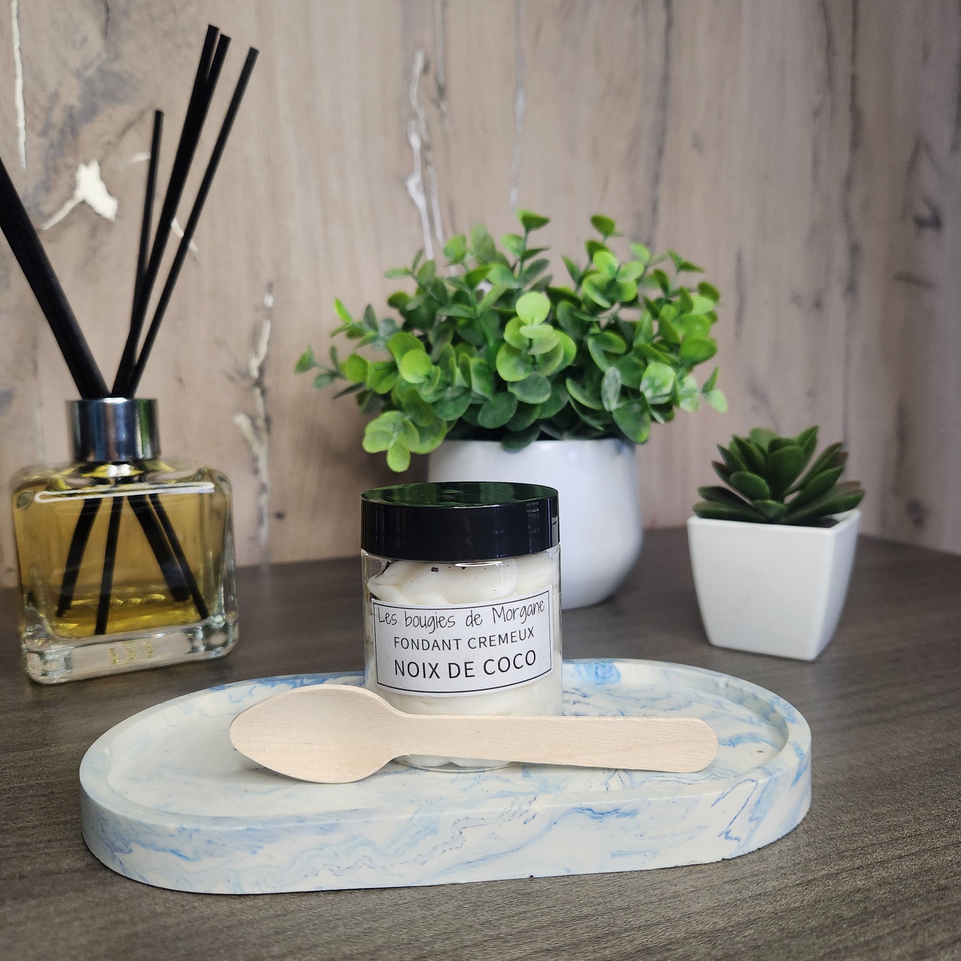 Ingrédients: Cire de soja 100% végétale, suivie de fragrance de Grasse, huile de coco, colorant. Cuillère en bois fourni avec le fondant.